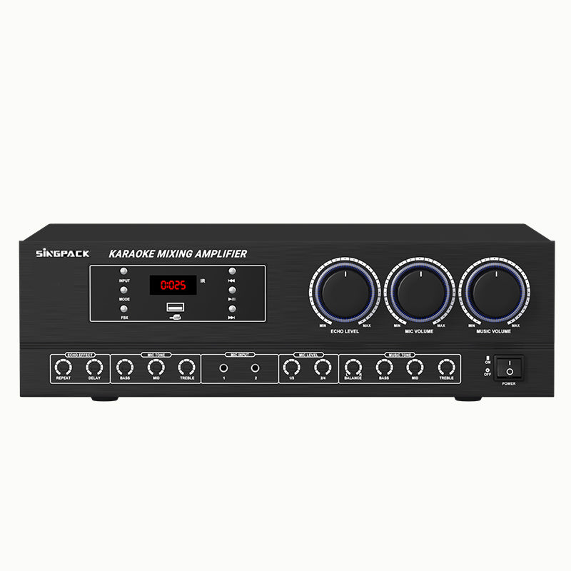Designed specifically for KTV singing, the amplifier integrates an effects processor, mixer, and high-power output in one unit. Clean interface, easy operation, and strong professional mixing capability. Supports multiple input sources, including AV, AUX, USB, Bluetooth, making it perfect for both karaoke and home theater use.